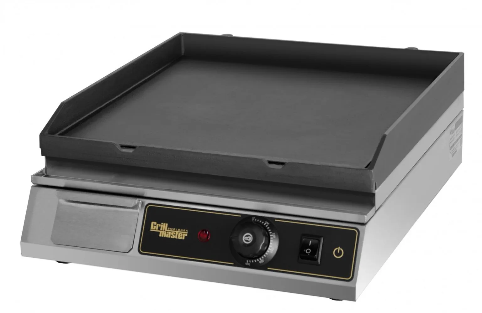 400Х520Х174мм, Гладкая чугунная жарочная поверхность, термостат +50-320С, лоток и выдвижная ёмкость для сбора жира, размер рабочей поверхности 400х420, исполнение полностью из нержавеющей стали, габаритные размеры 400х520х174 мм, вес нетто 14 кг, вес брутто 18 кг, габариты брутто 480х600х200мм